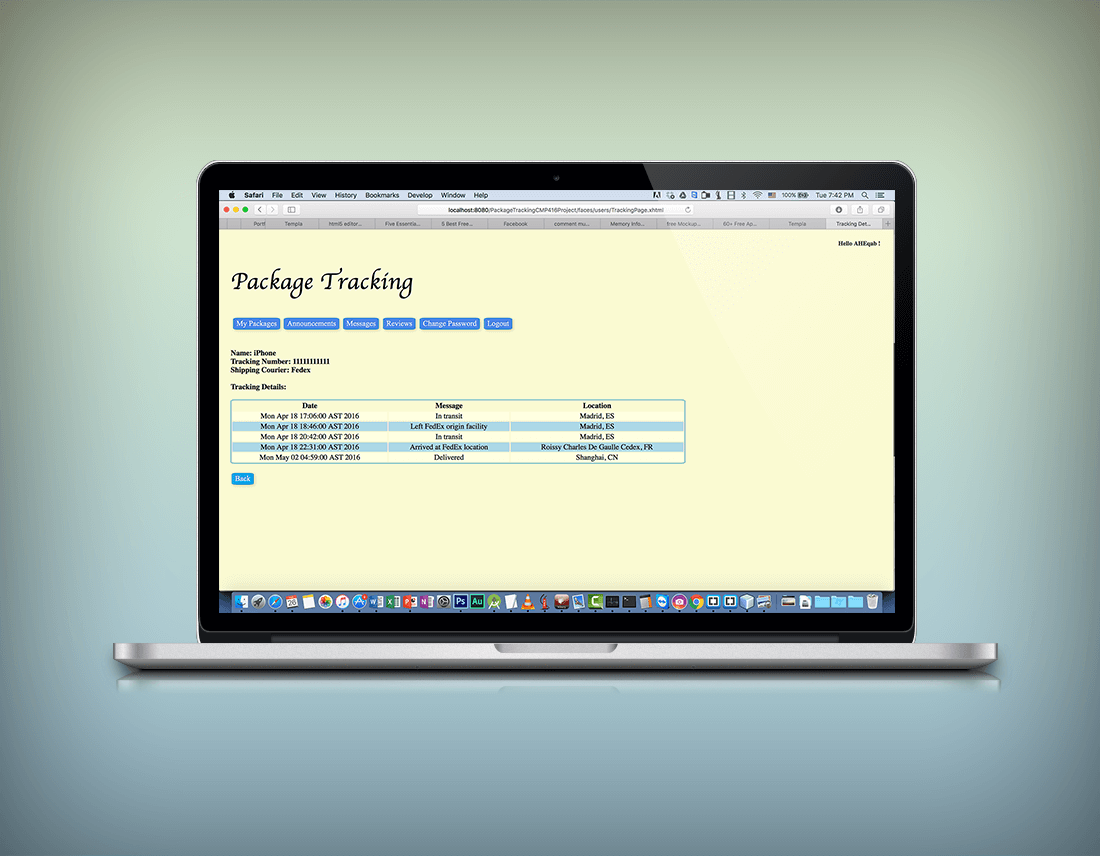 Users (which are the customers) can add packages to their account, delete packages, edit packages, search through their packages list, sort their packages list and track their packages (tracking was developed using GoShippo API). The users also can read the announcements posted by the shipping couriers or the admins, search the announcements and sort the announcements. The users can also send and receive direct messages. Furthermore, they can read reviews of the shipping couriers and post reviews with a rating (out of 5) of the shipping couriers. Users can register to the system. They can also change their passwords.